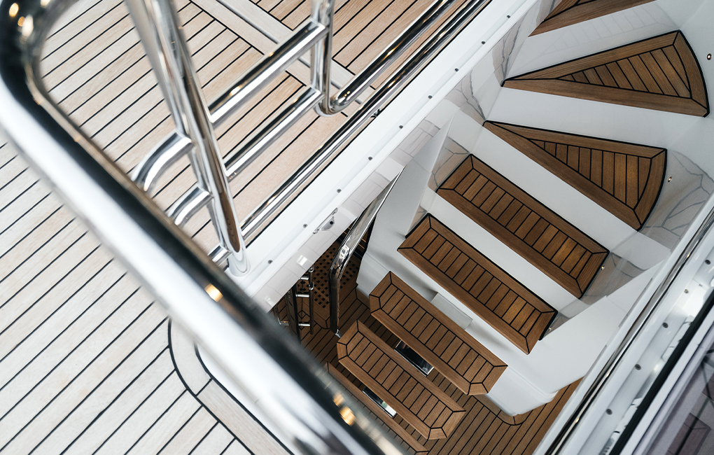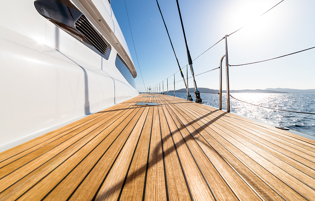 La coperta in teak viene levigata con macchinari dedicati, i giunti sono sigillati con poliuretanici nautici e le superfici rifinite con oli o vernici protettive anti-UV, per assicurare resistenza agli agenti atmosferici e lunga durata.